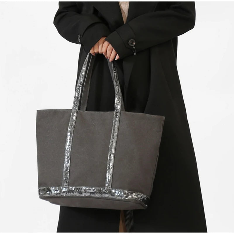 À la recherche d’un cabas aussi pratique que stylé ? Ne cherchez plus. Ce cabas en toile gris foncé est LA pièce passe-partout qui ne sacrifie rien au style. Avec son coloris sobre, ses finitions soignées et sa bande pailletée discrète, il ajoute une touche chic à toutes vos sorties – du bureau au café du samedi.