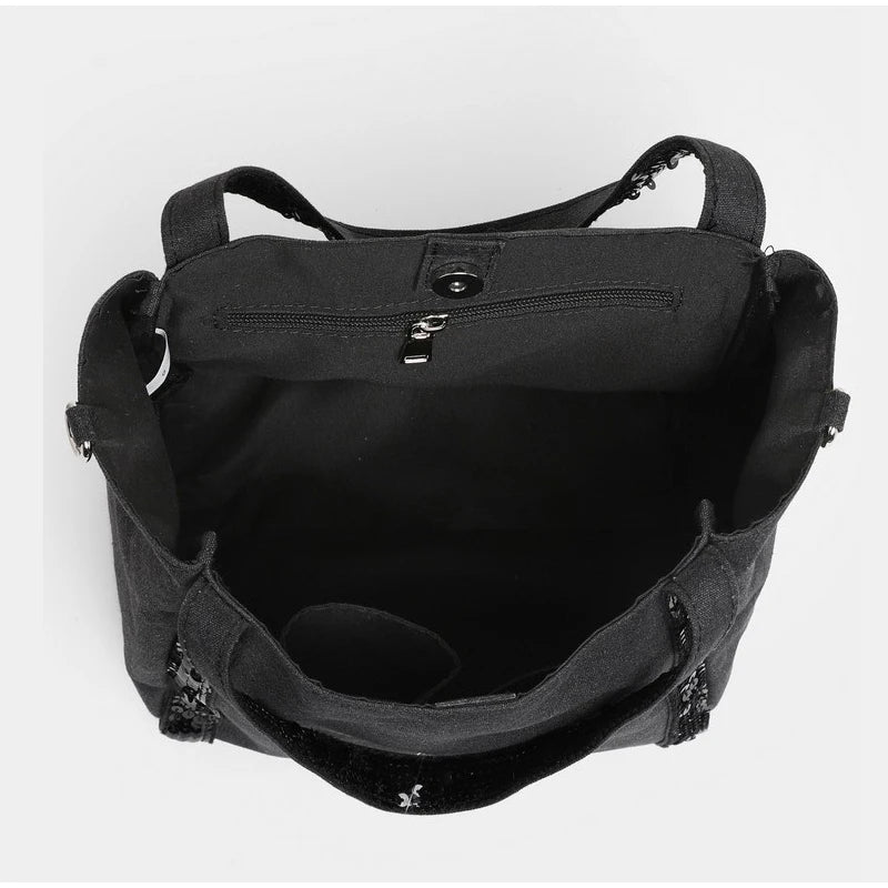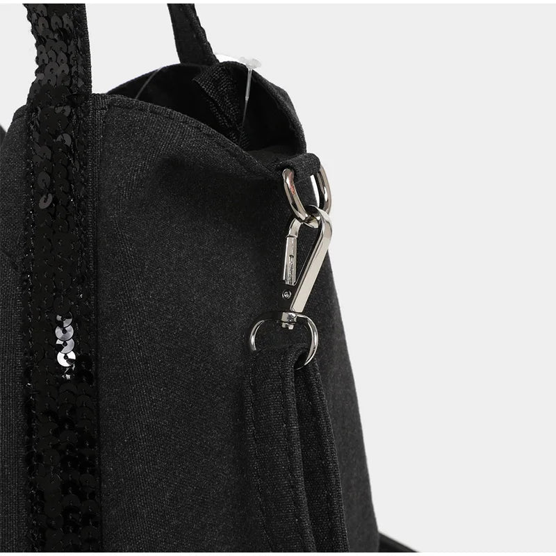 Conçu en toile canvas, il se distingue par ses bandes de paillettes noires ton sur ton, pour un rendu chic sans en faire trop. Que vous alliez au bureau, en ville ou en week-end, ce cabas deviendra vite votre allié stylé du quotidien.